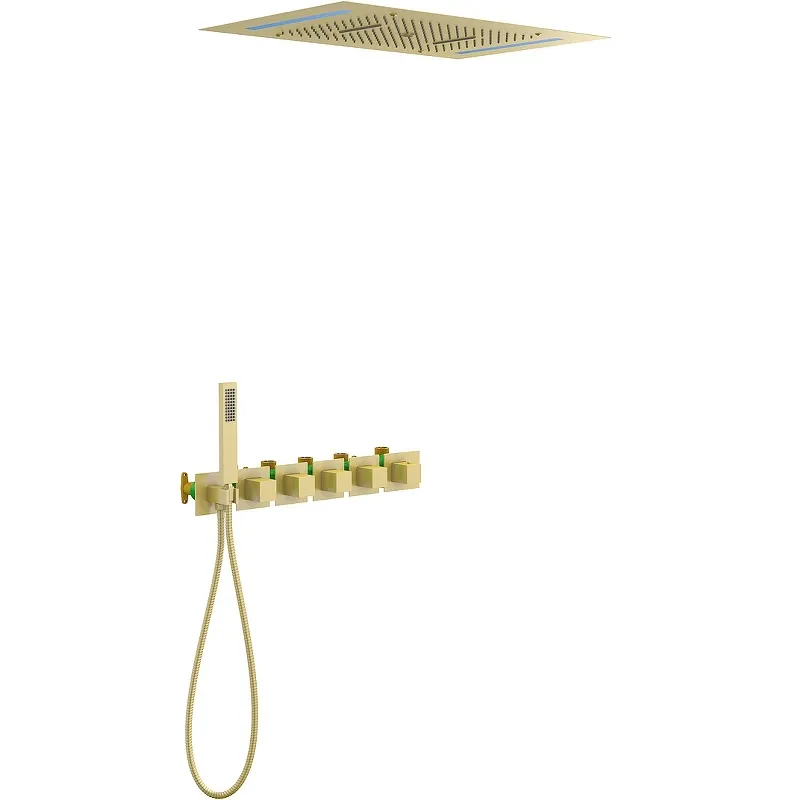 - Уникальный дизайн: Душевая система в современном стиле с матовым золотым покрытием станет украшением любой ванной комнаты.