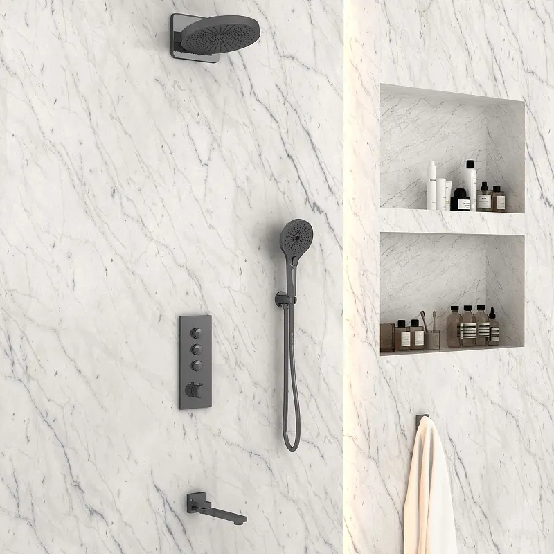 Душевая система Vincea Inspire VSFW-433TI1GM — идеальный выбор для современных ванных комнат. Выполненная в элегантном цвете вороненая сталь, она привнесет стиль и комфорт в ваше пространство. Встраиваемый монтаж позволяет экономить место, а управление с помощью термостата обеспечивает оптимальную температуру воды.