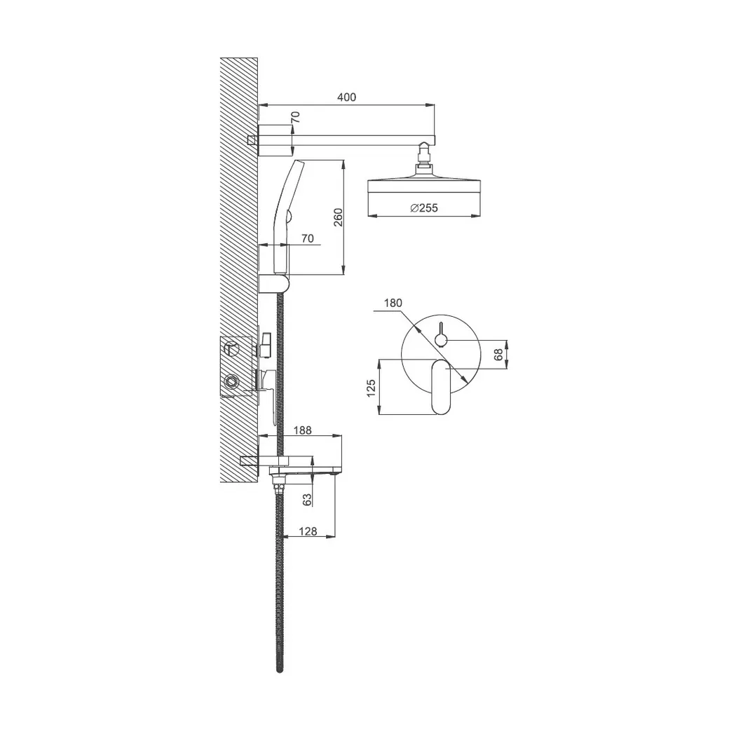 Система включает в себя шланговое подключение для смешанной воды с поворотным изливом и душевым шлангом. Излив оснащён аэратором, а его складывание служит переключателем потока воды на душевую лейку. Верхний душ диаметром 255 мм изготовлен из ABS-пластика и оснащён силиконовыми форсунками, которые легко очищаются от известкового налёта. Благодаря шарниру верхний душ можно регулировать по наклону вдоль всей оси.