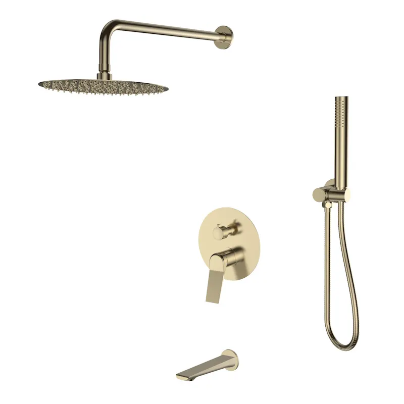 Душевая система скрытого монтажа "Shanghai Gold", арт. 7in1SHAGold: великолепие и надежность в каждом штрихе! Шикарное золотое покрытие и корпус из латуни придают ванной изысканный облик. Стационарный излив и фиксируемый дивертор обеспечивают удобство управления. Металлический шланг и функция легкой очистки ручного и верхнего душа гарантируют комфорт и долговечность. Преимущества: