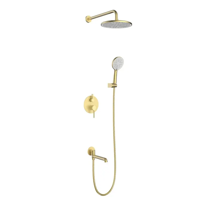 Душевая система встраиваемая Raglo R20.27.03, золотой сатин (матовое золото). Материал: латунь. Управление: однорычажное. Механизм: керамический картридж. Излив: поворотный. Аэратор. Диаметр верхнего душа: 250 мм. Форма верхнего душа и ручного душа: круглая. Количество режимов струи ручного душа: 3. Стандарт подводки: G 1/2. Монтаж: встраиваемый. Излив - функция переключения.