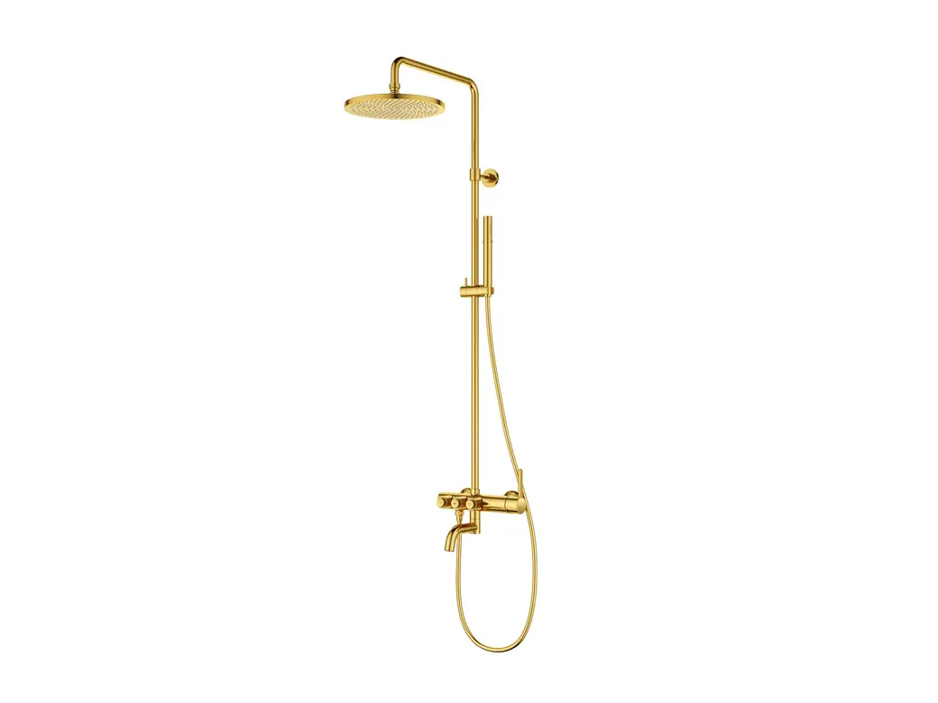 - Эстетика и стиль: Душевая стойка в цвете брашированного золота придаст вашей ванной комнате роскошный и современный вид.