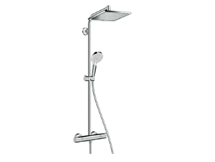 Душевая стойка, Hansgrohe, Crometta E, смеситель-есть, тип открывания воды-вентильный, тип регулирования воды-термостатический картридж, верхний душ-есть, форма верхнего душа-квадратная, размер верхнего душа-240*240, держатель верхнего душа-есть, вынос, мм-355, количество режимов верхнего душа-1, тип струи-Rain, размер штанги, мм-1034, ручной душ-есть, размер ручного душа-100, количество режимов ручного душа-2, тип струи-Rain, IntenseRain, шланг-есть, размер шланга, мм-1600, цвет-хром арт-27271000