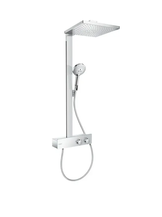 Душевая стойка, Hansgrohe, Raindance E, смеситель-есть, тип регулирования воды-термостатический картридж, верхний душ-есть, форма верхнего душа-квадратная, размер верхнего душа-300, держатель верхнего душа-есть, вынос, мм-405, количество режимов верхнего душа-1, тип струи верхнего душа-RainAir, размер штанги, мм-1066, ручной душ-есть, диаметр лейки, мм-128, форма лейки-круглая, шланг-есть, цвет-хром, держатель ручного душа регулируется в пределах 90°, поворачивается вправо и влево, перемещается вверх и вниз, шарнирное соединение: регулируемый угол верхнего душа, поверхность полочки: анодированный алюминий, поверхность крышки-зеркальное стекло, предохранительный ограничитель при 40°C, пользовательское управление посредством вращения рукоятки, соединительная резьба G 1⁄2 арт-27361000