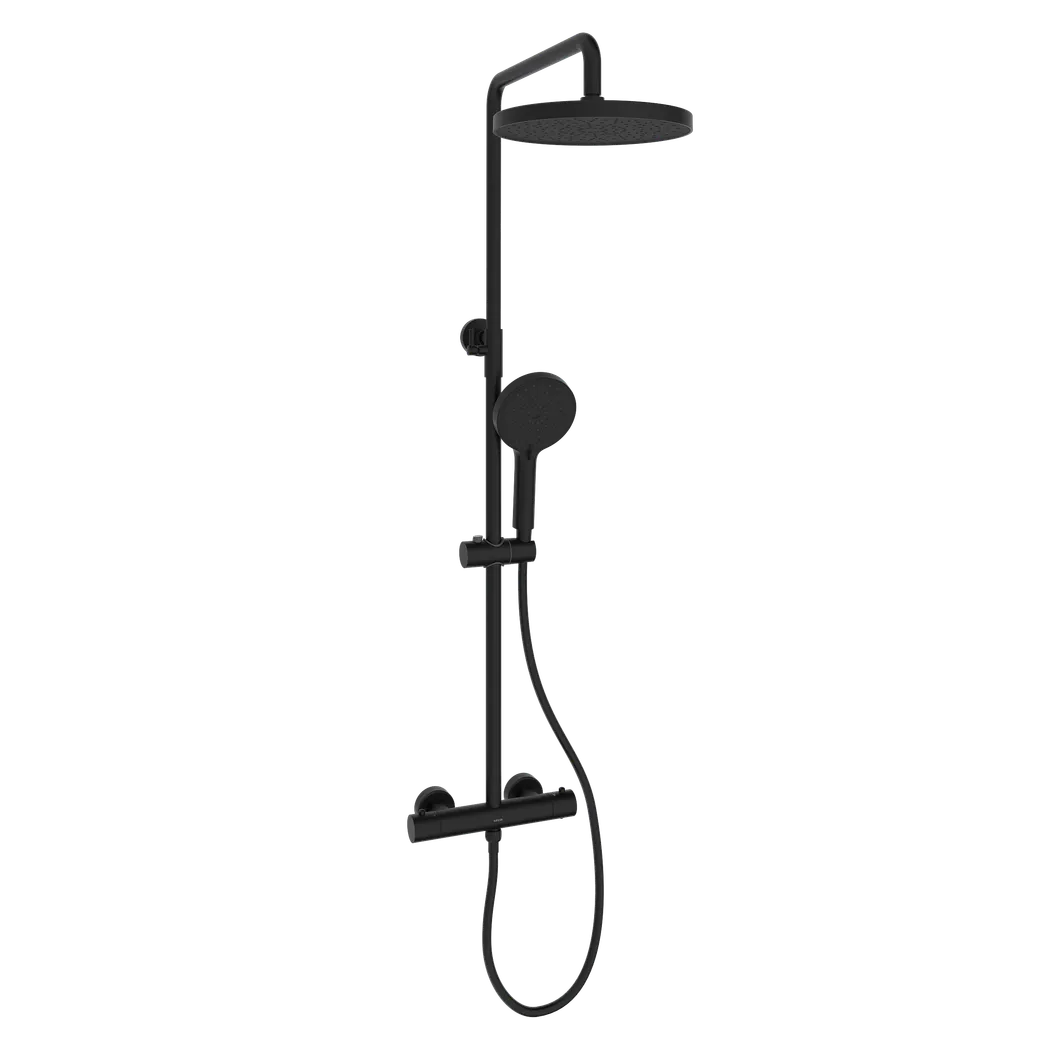 Душевая стойка Sancos Teo c термостатом, с регулировкой по высоте, c верхним душем Ø250 мм , ручным душем Ø130 мм, 3 режима, цвет черный матовый, арт. SC11001MB