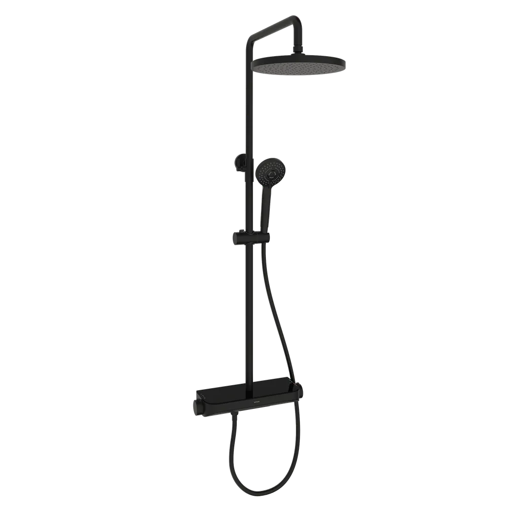 Душевая стойка Sancos Teo c термостатом, встроенным изливом, полкой и с регулировкой по высоте штанги, c верхним душем Ø250 мм , ручным душем Ø100 мм, 3 режима, цвет черный матовый, арт. SC11002MB