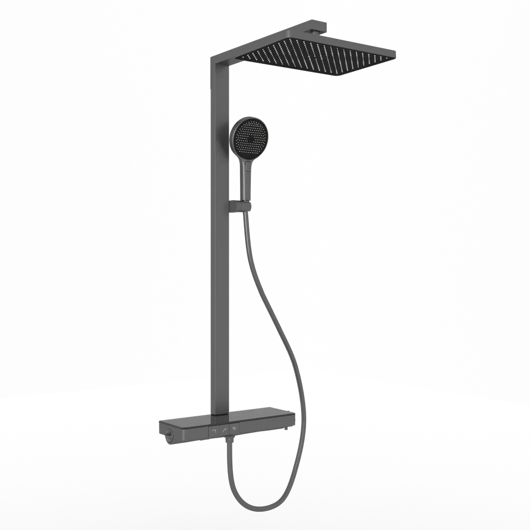 Душевая стойка SANCOS Vos с термостатическим смесителем, изливом, полкой, шлангом 1,5 м, верхним и ручным душем, цвет вороненая сталь, арт. арт-SC6100GG