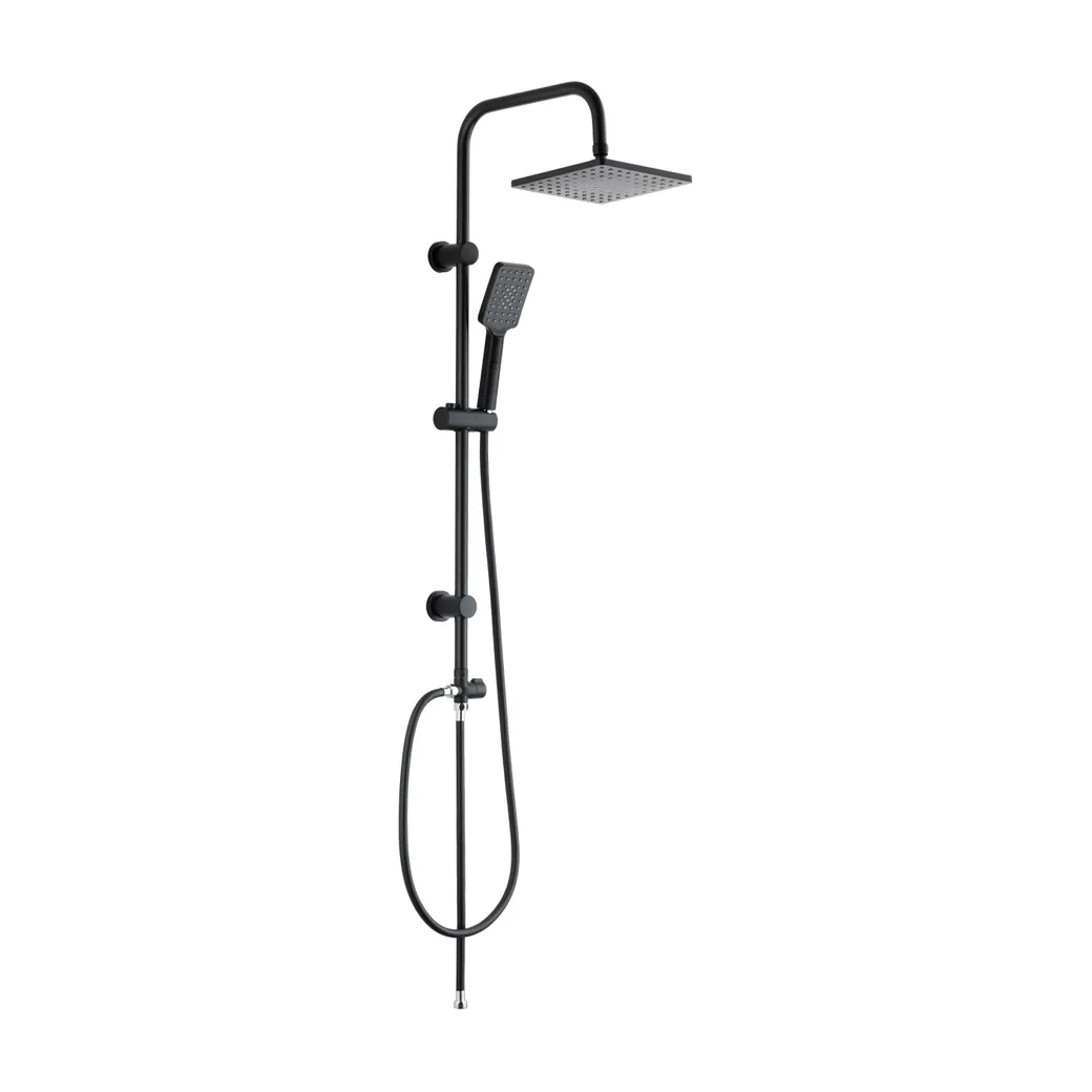 Душевая стойка из нержавеющей стали, покрытие чёрное матовое, высота стойки 960 мм, в комплект входит лейка тропическая квадратная, лейка+шланг1500мм, шланг 400мм, дивертор, два круглых чёрных крепления к стене
