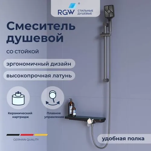 Душевой гарнитур RGW SP-41-Gr сочетает в себе стильный дизайн и функциональность. Смеситель душевой RGW SP-41-Gr изготовлен из сантехнической латуни, что гарантирует долговечность и надежность. Уникальная конструкция с полкой для душевых принадлежностей и удлиненным изливом обеспечивает максимальный комфорт в использовании.