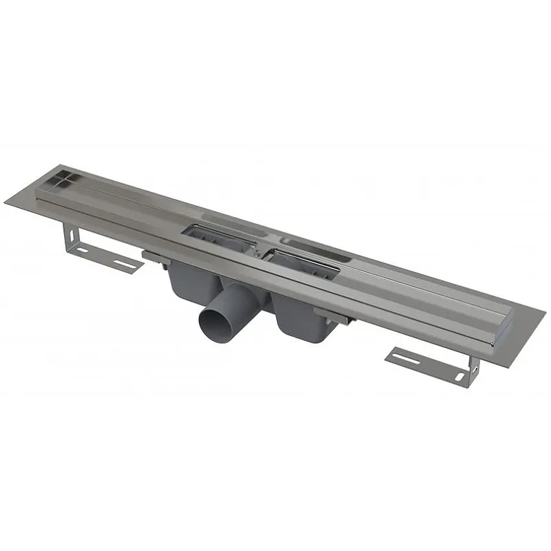 Душевой лоток Alcaplast APZ1S-550.Характеристики: Цвет: серый. Материал лотка: нержавеющая сталь 2 мм, AISI 304, DIN 1.4301. Материал сифона: полипропилен. Направление выпуска: горизонтальный. Сток воды: 60-68.8 л/мин. Сточная труба: 50 мм. Гидрозатвор: 50 мм. Класс нагрузки: КЗ 300 кг. Общая высота монтажа: 100-158 мм. Регулируемый по высоте. Высота монтажа от 85 мм. Сопротивление гидрозатвора против давления 982 Па. Высокая скорость стока возможна благодаря двухкамерному сифону. Вручную легко чистящийся сифон, вплоть до сточной трубы. Сифон прочно соединяется с желобом. Самоклеящиеся ленты для качественной гидроизоляции. Водоотводящий желоб из нержавеющей стали (обработанной методом травления и пассивации, а также прошедшей электрохимическую полировку). В комплекте поставки: Душевой лоток с сифоном. Монтажный набор: шуруп 6×50 – 2 шт., дюбель 10 – 2 шт. Самоклеящиеся гидроизоляционные ленты. Защитная пленка для воротника. Монтажная крышка желоба - полистирол.