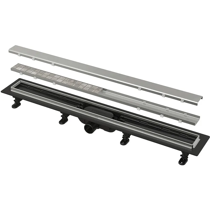 Душевой лоток Alcaplast APZ20-950.Характеристики: Цвет решетки: нержавеющая сталь. Материал: нержавеющая сталь, полипропилен обогащенный тальком, устойчив к механическим, химическим и термическим повреждениям. Водоотводящий желоб с порогами из нержавеющей стали. Двусторонняя решетка: цельная решетка или решетка под кладку плитки. Размер решетки: 942 мм. Сливной трап из особопрочного пластика, который устойчив к морозам и химии. Регулируемые монтажные ножки 0-35 мм, позволяют быстро и удобно установить желоб и выровнять его в горизонтальной плоскости. Идеальная совместимость с гидроизоляцией здания. Комбинированный гидрозатвор обеспечивает надежную защиту от проникновения запаха из канализации и после высыхания воды в сифоне. Легко чистящийся сифон, вплоть до сточной трубы. Для водоотведения в душевых на уровне пола. Может располагаться в пространстве или непосредственно у стены. Для безбарьерного доступа. Диаметр сливной трубы: 40 мм. Пропускная способность: 24 л/мин. Направление выпуска: горизонтальный. В комплекте поставки: Душевой лоток. Двусторонняя решетка. Монтажный комплект. Самоклеящиеся гидроизоляционные ленты. Гидрозатвор - комбинированный SMART. Регулируемые по высоте ножки 2 шт.