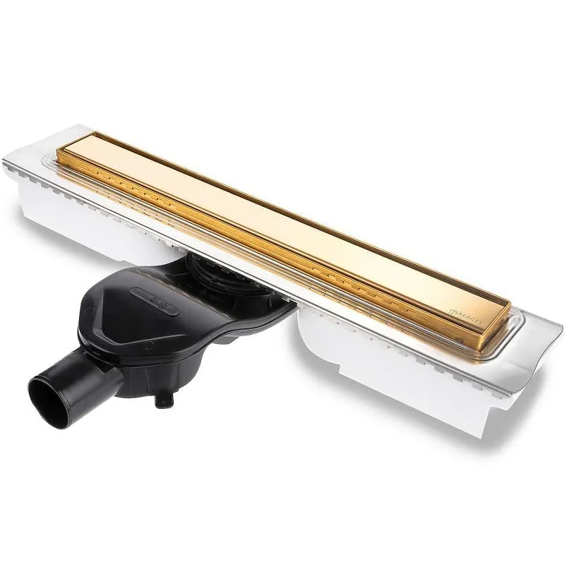 Душевой лоток Berges Wasserhaus B1 Keramik 600 092117 с решеткой. Превосходно сочетается с любым интерьером ванной комнаты благодаря компактным размерам и функциональности.Характеристики: Цвет решетки: золото глянец. Материал: нержавеющая сталь/полипропилен. Форма: прямоугольная. Размер решетки (ДхШ): 60x6,1 см. Вид решетки: продольная (со щелью для воды). Двусторонняя установка решетки: металл и вклейка плитки с регулировкой по толщине плитки от 8 до 25 мм. Вид затвора: гидрозатвор. Направление выпуска: горизонтальный (боковой). Максимальная пропускная способность: 42 л/мин. Монтажная заглушка и регулируемые по высоте ножки (пенопласт). Самопромывной S-образный сифон РР: выпуск D50-H60, монтаж 360 градусов. В комплекте поставки: душевой лоток, решетка.