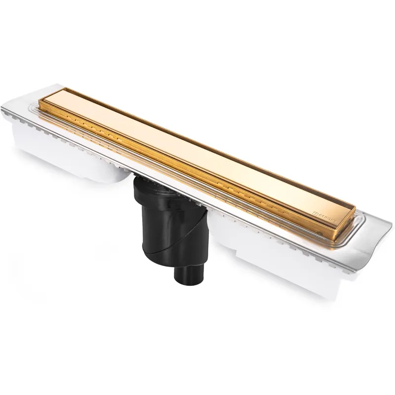 Душевой лоток Berges Wasserhaus B1 Keramik 700 092018 с решеткой. Превосходно сочетается с любым интерьером ванной комнаты благодаря компактным размерам и функциональности.Характеристики: Цвет решетки: золото глянец. Материал: нержавеющая сталь/полипропилен. Форма: прямоугольная. Размер решетки (ДхШ): 70x6,1 см. Вид решетки: продольная (со щелью для воды). Двусторонняя установка решетки: металл и вклейка плитки с регулировкой по толщине плитки от 8 до 25 мм. Вид затвора: гидрозатвор. Направление выпуска: вертикальный. Максимальная пропускная способность: 48 л/мин. Монтажная заглушка и регулируемые по высоте ножки (пенопласт). Самопромывной S-образный сифон РР: выпуск D50/105-H30/105, монтаж 360 градусов. В комплекте поставки: душевой лоток, решетка.
