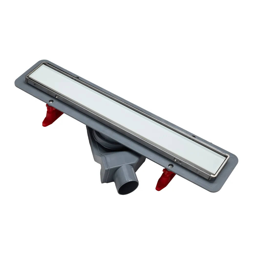 Душевой лоток POINT Деметра с решеткой из нержавеющей стали с вставкой из белого стекла отличается новой минималистичной стальной рамкой, которая закрывает все видимые пластиковые детали слива. Состоит из основания из ABS-пластика, стальной реверсивной решётки для лотка, рамки для внешней решетки, улавливателя для волос, соединительного переходника с резиновым уплотнителем и S- образного сифона, изготовленного из полипропилена. Выходное отверстие - 50 мм, минимальная высота установки - 52 мм, пропускная способность - 48 л/мин. Сифон самоочищающийся с высотой гидроизоляции 25 мм, вращающийся на 360 градусов, с регулируемым по высоте редуктором для линейного слива, ножками для регулировки высоты и наклона, с набором для установки сухого затвора и грязеуловителем. Реверсивная решетка из нержавеющей стали AISI 304 класса K3 с возможностью использования как стороной со стеклом, так и стороной со стальным основанием.