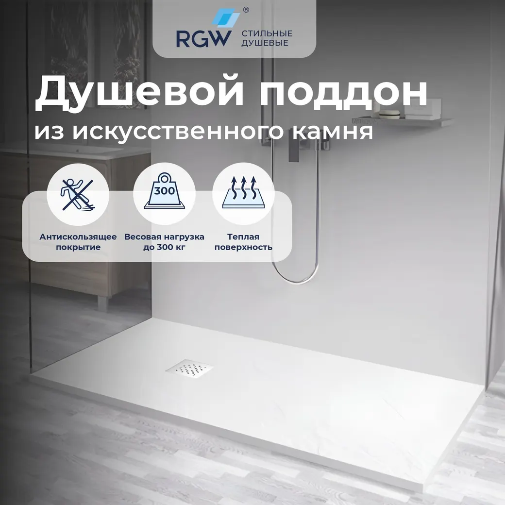 Искусственный камень — это композитный материал, в составе которого полимерная смола и мраморная крошка. Поверхность поддона покрыта специальным Гелькоутом, который придает изделию стойкость к механическим повреждениям и агрессивным средам, а также обеспечивает долговечность. Антискользящая поверхность поддона имитирует натуральный камень и выдерживает нагрузку до 300 кг, что гарантирует безопасность при использовании. Разнообразие форм: поддоны доступны в конфигурациях квадрат, полукруг, прямоугольник и трапеция (пятиугольные), что позволяет выбрать подходящий вариант для вашего интерьера. Широкий размерный ряд: от 800x800 мм с шагом в 10 см до максимального размера 900x1200 мм, что дает возможность подобрать оптимальный поддон для вашей ванной комнаты. Монтаж в пол — поддон устанавливается в один уровень с полом для создания безбарьерного доступа, визуально расширяя пространство ванной комнаты. Доступная среда: отсутствие бортика позволяет создать удобный доступ в ванную комнату для людей с ограниченными возможностями здоровья. Гибкость установки: при невозможности утопить сливные трубы в стяжку, можно установить поддон на ножки RGW N-01(10), а образовавшееся пространство закрыть экраном GW N/ST. Технический уклон поддона обеспечивает быстрый слив воды в течение 20-30 секунд, даже при использовании крупной лейки или тропического душа. Сифон и решетка приобретаются отдельно. Решетка из нержавеющей стали (цвет Хром 304) и Сливной сифон Stone S-2 не включены в комплект, что позволяет избежать проблем с транспортировкой и недоставкой при совместной упаковке. Антивандальная упаковка гарантирует безопасную доставку поддона в любой уголок мира без повреждений. Срок службы поддона составляет не менее 25 лет, что делает его надежным выбором для долгосрочной эксплуатации.