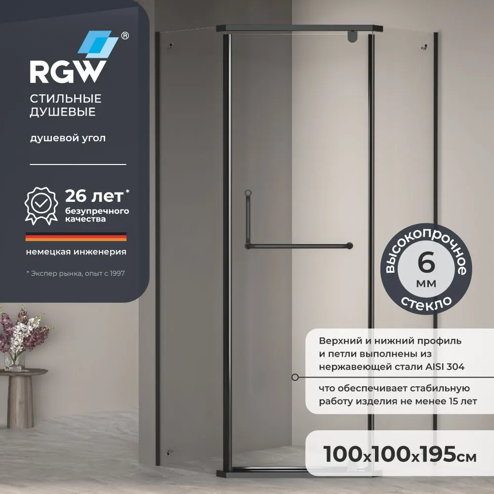 Душевой уголок 100x100 от бренда RGW — это стильное и надежное решение для вашей ванной комнаты. Этот стеклянный душевой уголок с распашными дверями и черным профилем станет функциональным элементом любого интерьера. Изготовленный из прозрачного стекла толщиной 6 мм, он обеспечивает безопасность и долговечность. Покрытие Easy Clean значительно облегчает уход за поверхностью, предотвращая образование налета. Удобная доставка по России.