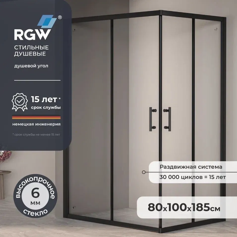 Душевой уголок 80x100 RGW с прозрачными стеклянными панелями и чёрным анодированным профилем станет стильным и функциональным дополнением вашей ванной комнаты. Эта модель без поддона идеально подходит для тех, кто ищет современное решение с раздвижными дверями и надёжной герметичностью.