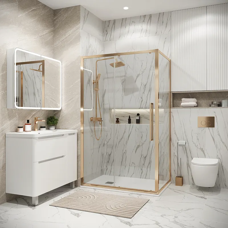 Ищете стильное и функциональное решение для вашей ванной комнаты? Душевой уголок Grossman Cosmo 130х70 с профилем цвета золото сатин и прозрачным закаленным стеклом идеально подойдет для современного интерьера. Этот стеклянный душевой уголок с раздвижными дверями и универсальной ориентацией легко установить, как на поддон, так и на пол.