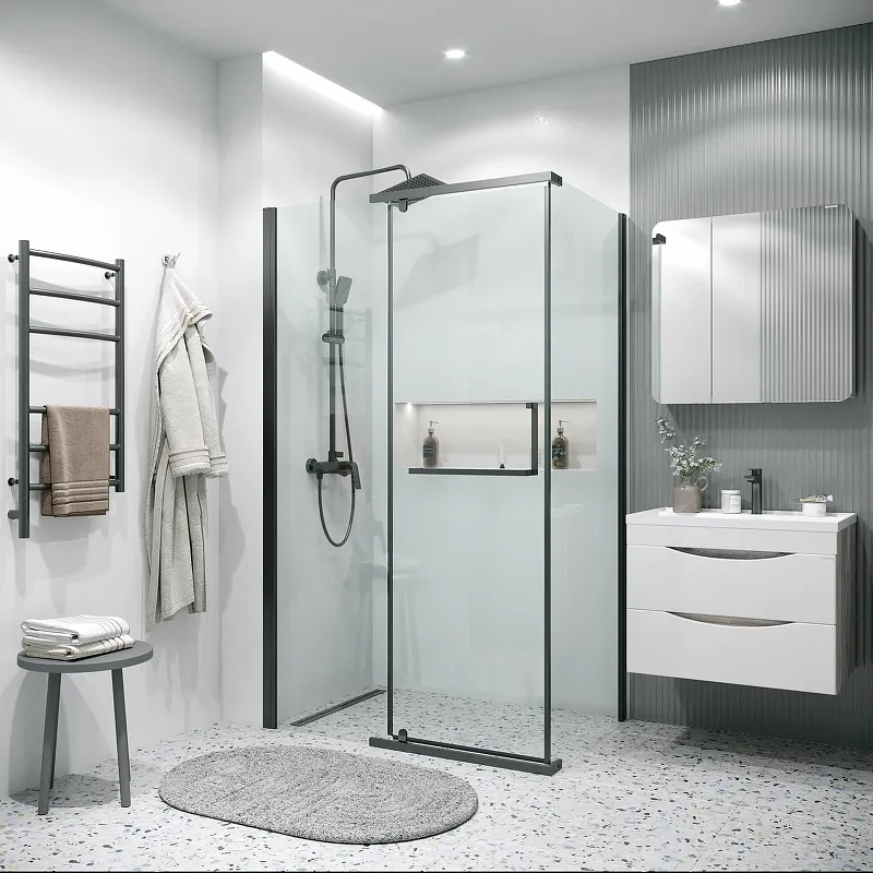- Элегантный дизайн: Черный матовый профиль из анодированного алюминия и прозрачное стекло создают современный и стильный вид.