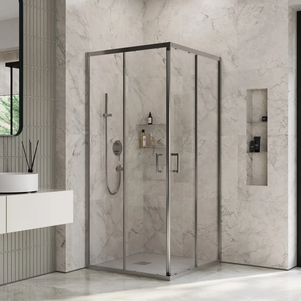 - Современный дизайн: Хромированный профиль и прозрачное стекло создают стильный вид.