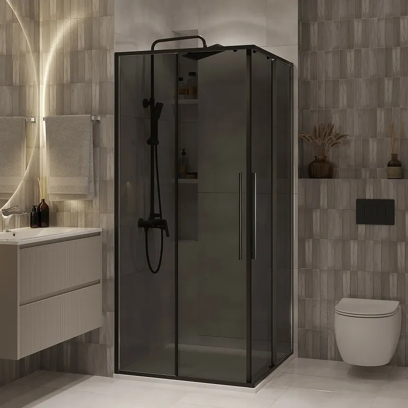 Душевой уголок Niagara Nova 90х90 — это современное решение для вашей ванной комнаты. Купить душевой уголок с черным матовым профилем и тонированным стеклом — значит обеспечить стильный и функциональный интерьер. Этот стеклянный душевой уголок с раздвижными дверями идеально впишется в пространство 90x90 см и подойдет для установки как на поддон, так и на пол.