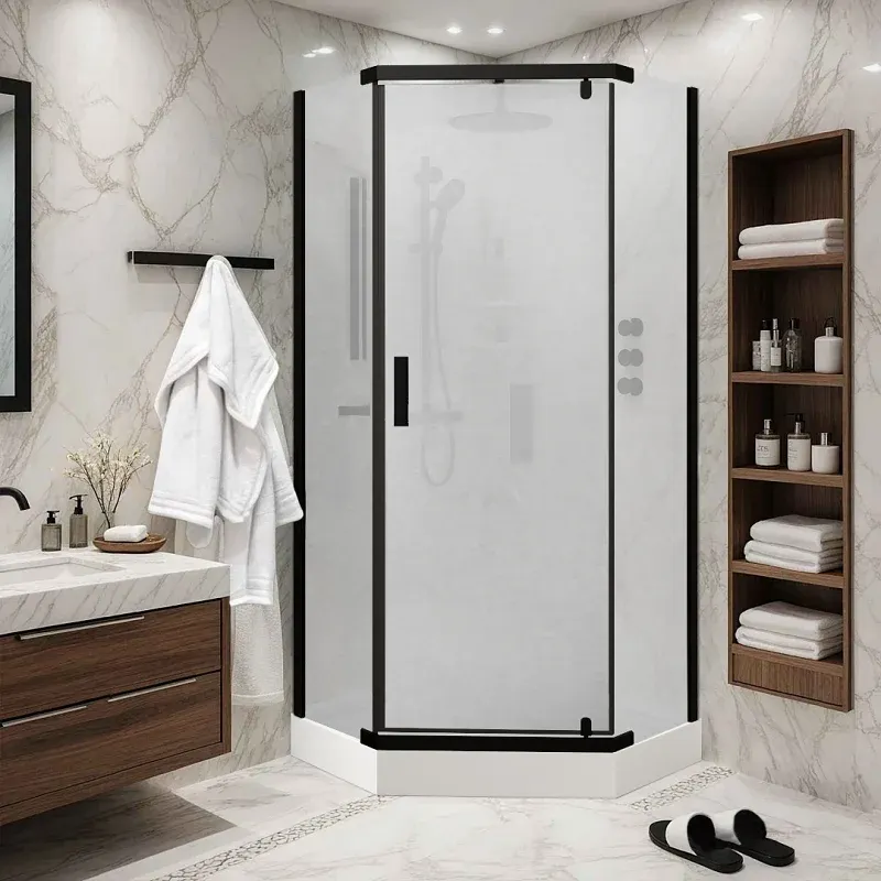 - Эстетичный дизайн: Черный алюминиевый профиль и трапециевидная форма делают уголок стильным акцентом в ванной комнате.