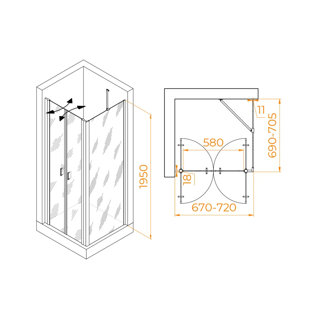 Высота душевого угла составляет 1950 мм, что позволяет вам полностью наслаждаться душем, не беспокоясь о попадании воды за его пределы. Класс герметичности этого душевого угла - 2 класс, что гарантирует, что вода не вытечет из душевого угла и не повредит ванную комнату.