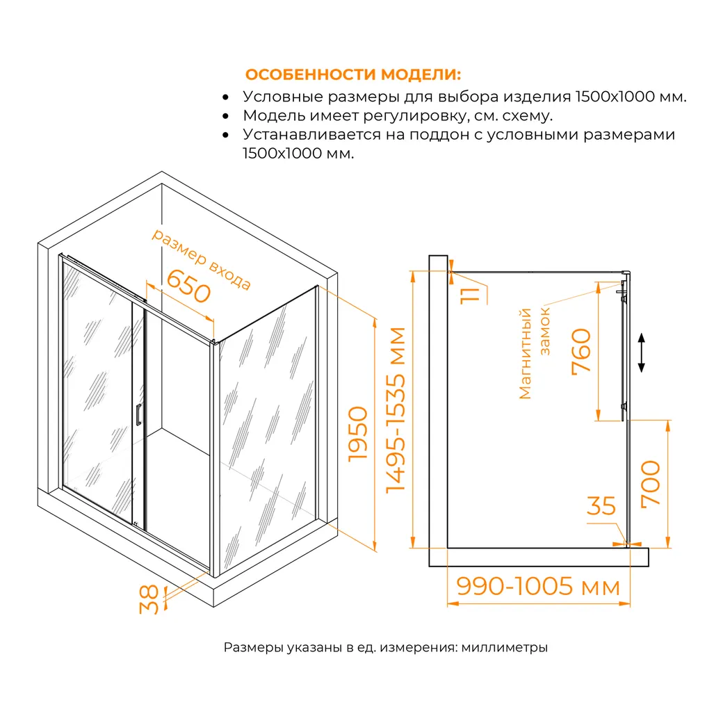 Внешний вид душевого уголка очень стильный и современный, что подчеркивается цветом профиля - хромом. Высота душевого угла составляет 1950 мм, что позволяет использовать его даже для очень высоких людей.