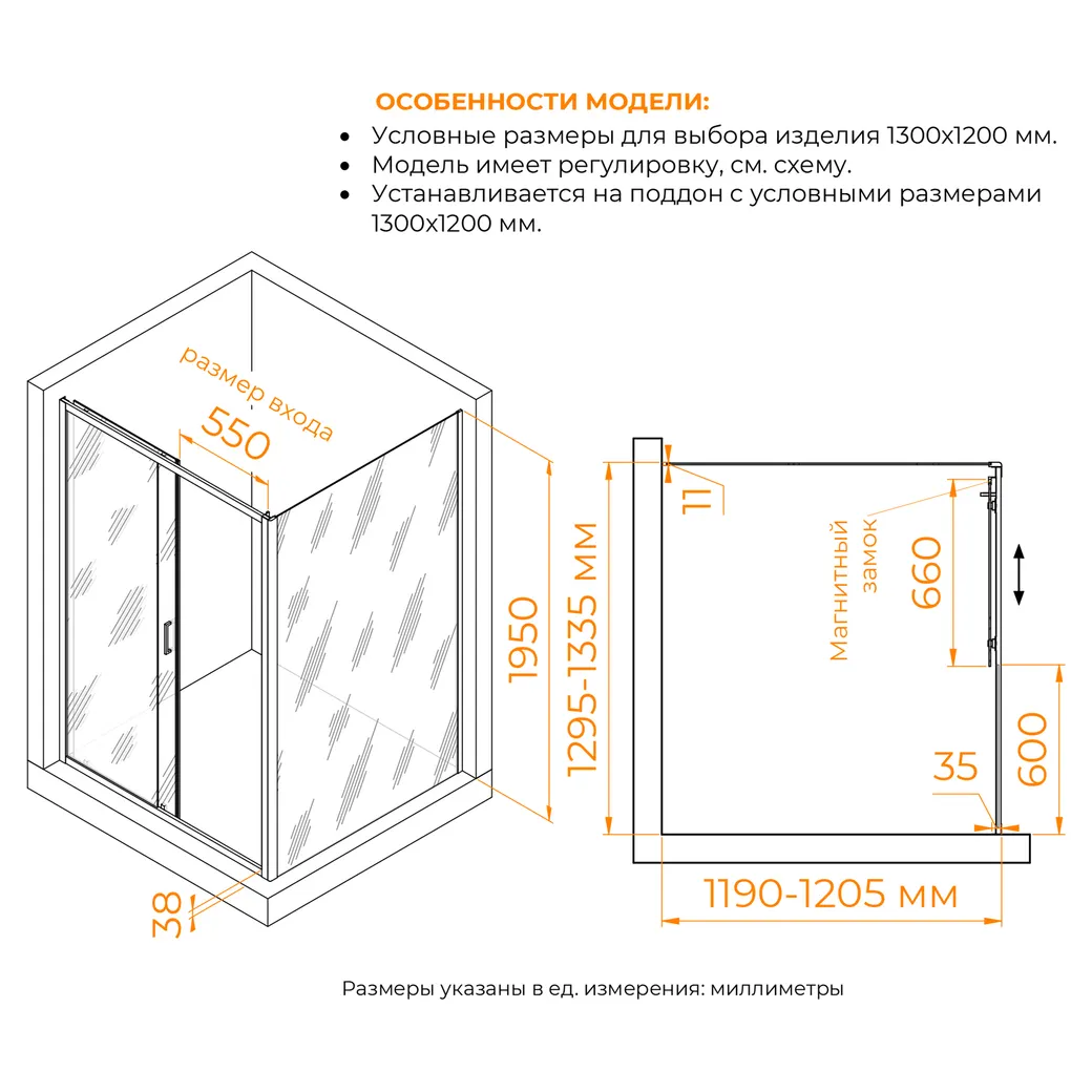 Высота душевого угла составляет 1950 мм, что позволяет легко входить и выходить из душа. Конструкция дверей раздвижная, что обеспечивает удобство использования и экономию пространства. Двойные регулируемые ролики обеспечивают плавное и бесшумное открытие и закрытие дверей.