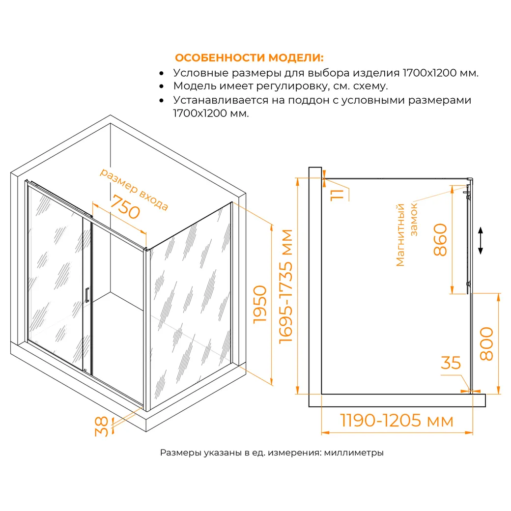 Высота душевого угла составляет 1950 мм, что позволяет легко входить и выходить из душа. Конструкция дверей раздвижная, что обеспечивает удобство использования и экономию пространства. Двойные регулируемые ролики обеспечивают плавное и бесшумное открытие и закрытие дверей.