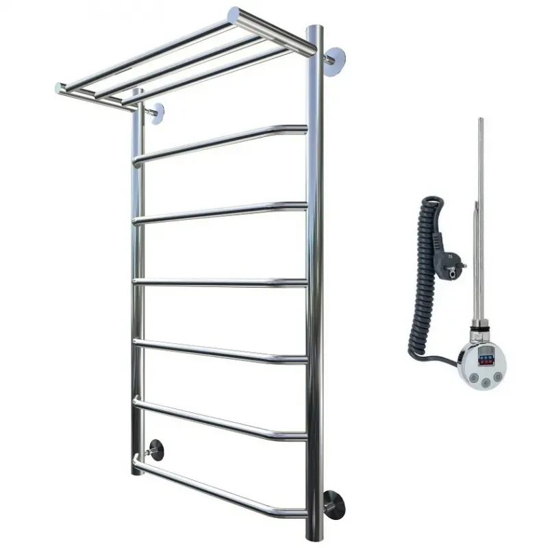 - Электрический полотенцесушитель с полочкой: Удобное хранение и сушка полотенец.