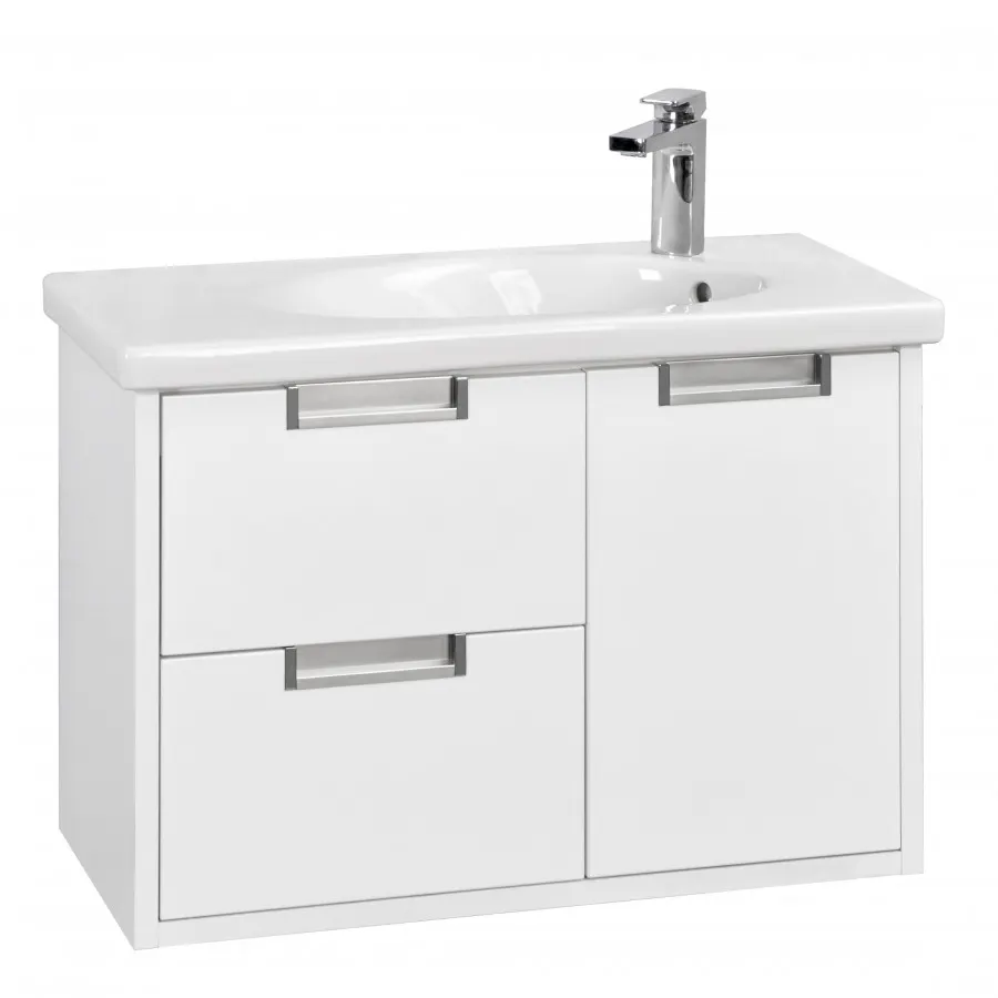 Тумба под раковину прямоугольной формы из влагостойкой ЛДСП монтаж подвесной, с двумя выдвижными ящиками и одной дверцей с доводчиком, фурнитура хром.