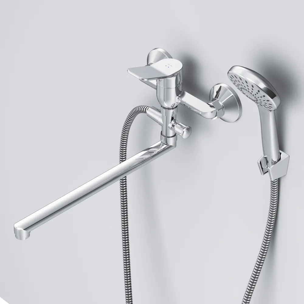 Стильное универсальное решение для ванной комнаты - качественный смеситель для ванны и душа с длинным поворотным изливом с душевым набором. Универсальный длинный излив позволяет использовать смеситель как для ванны так и для рядом стоящей раковины. Функциональный держатель для ручного душа на два положения добавит удобства использования. Душевой шланг длиной 150 см позволит наслаждаться душем даже высокому человеку. Максимум функций за разумную плату в одном изделии! Ультрамодный дизайн ручки придает смесителю дополнительную динамику и дарит непревзойденную легкость управления. Вы почувствуете это с первого прикосновения. Точная инженерия для Вашего комфорта: благодаря обширной зоне движения ручки управлять температурой воды стало еще проще. ""
