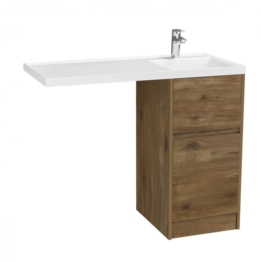 Комплект фасадов для тумбы Лондри под стиральную машину выполнен из влагостойкой ламинированной плиты в древесной отделке цвета Дуб рустикальный. Корпус тумбы и фасад приобретаются отдельно. Верхний ящик открывается с помощью системы push-to-open, а нижний - за фасад с помощью удобного выпила под углом. Ящики выдерживают нагрузку до 25 кг. Тумба установлена на регулируемые опоры, которые находятся за цоколем. Тумба комплектуется раковиной Лондри 105 из прочного литого мрамора, который устойчив к воздействию химических средств. Широкое крыло раковины обеспечивает ванную комнату дополнительным функциональным пространством. Дополнительно к тумбе можно приобрести шкаф-колонну Лондри и зеркальный шкаф Лондри 100.
