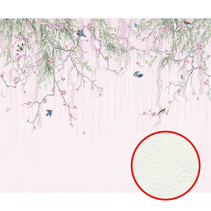 Фреска Ortograf Chinoiserie 33935 Фактура флок FLK Флизелин (4*2,7) Белый/Розовый/Зеленый, Цветы/Птицы