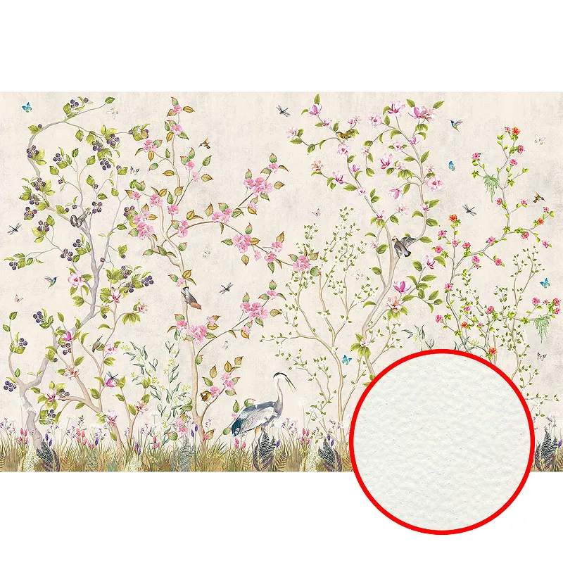 Фреска Ortograf Chinoiserie 33942 Фактура флок FLK Флизелин (4*2,7) Белый/Зеленый/Розовый, Деревья/Цветы/Птицы