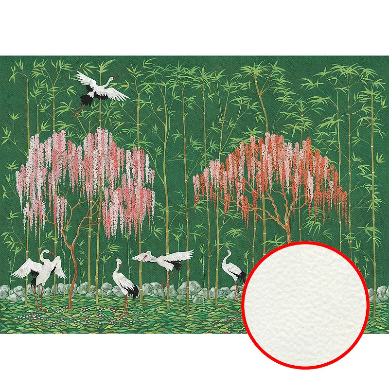 Фреска Ortograf Chinoiserie 33961 Фактура флок FLK Флизелин (4,2*3) Зеленый/Розовый, Деревья/Листья/Птицы
