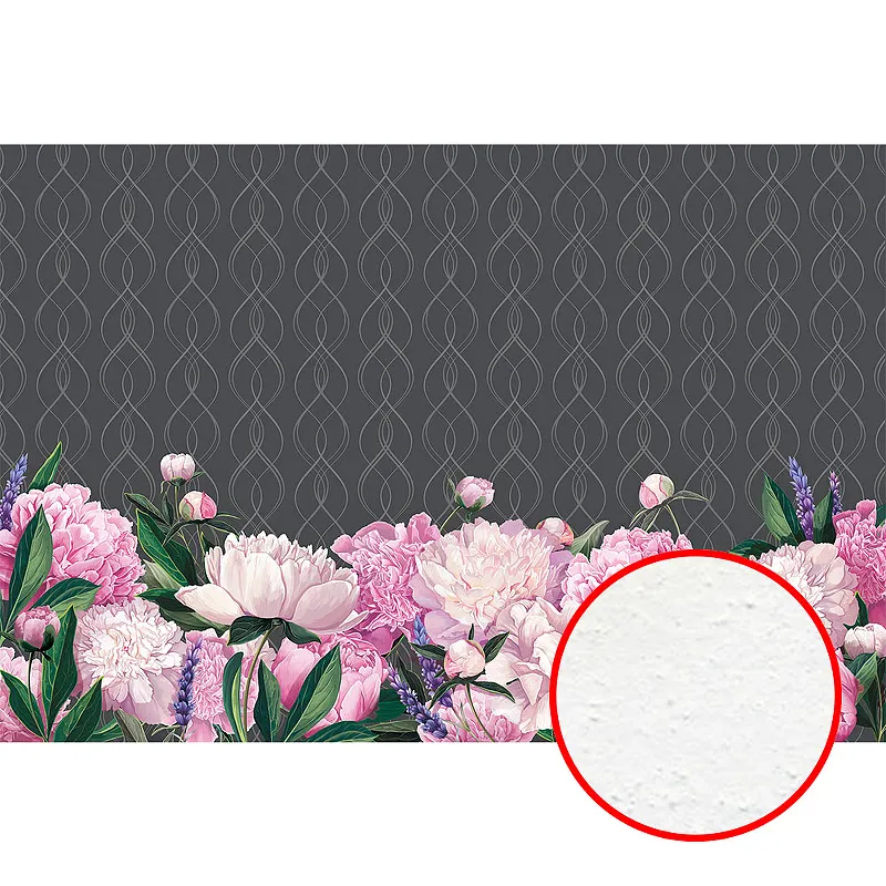 - Фреска с рисунком цветы в сером, розовом и зелёном цветах добавит яркости и живости в интерьер вашего дома.