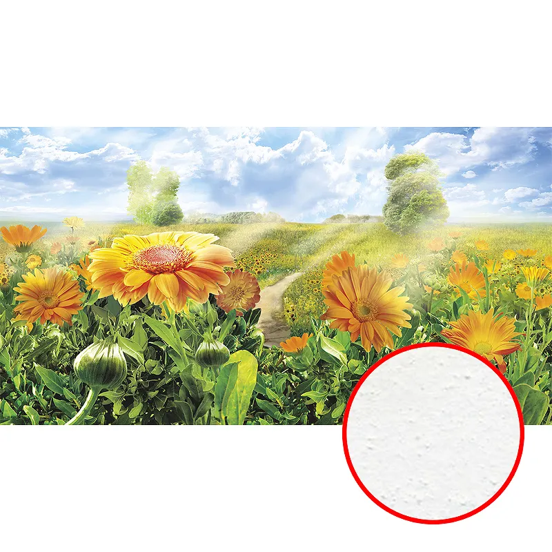 - Флизелиновая основа (5x2,7 м) с фактурой бархат FX, разноцветный рисунок цветов и пейзажа.