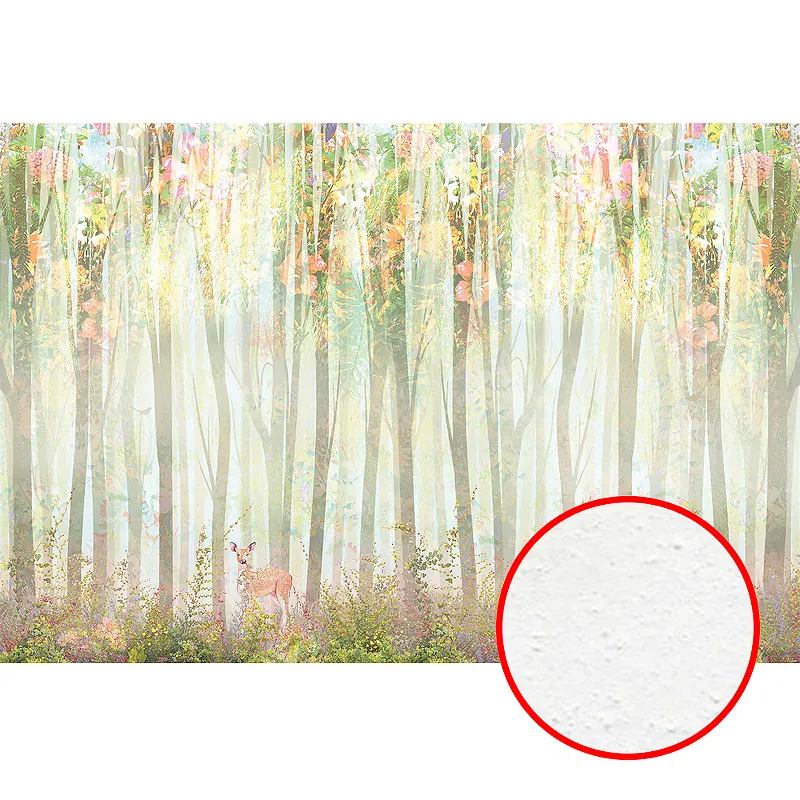 - Разноцветный рисунок с деревьями и животными: Привносит в помещение живописность и природные нотки, идеален для создания акцентной стены.