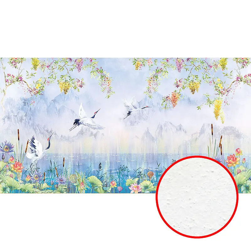 - Флизелиновая основа размером 5 м x 2,7 м с рисунком "Птицы, цветы" в фиолетово-разноцветных тонах.