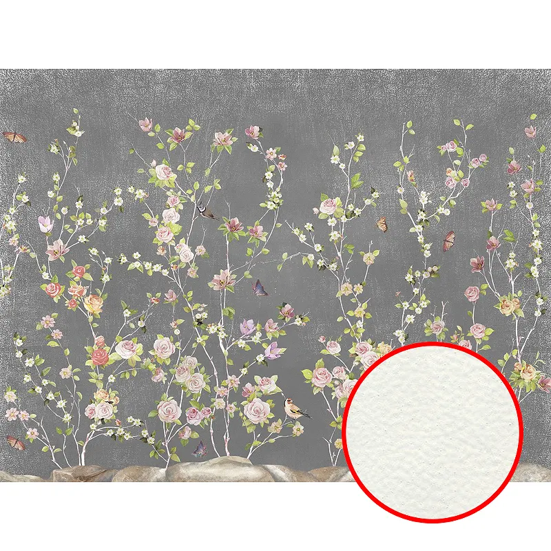 - Флизелиновая фреска с текстурой флок: обеспечивает мелкозернистый рельеф, который добавляет глубину и объём в интерьере.