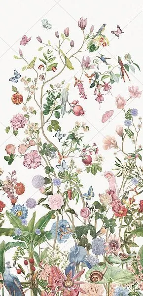 Фрески Affresco из коллекции Art Fabric представляют собой рулонный декор, имитирующий классическую фреску. Данный продукт сочетает в себе элементы природы, такие как цветы и птицы, что делает его подходящим для оформления различных интерьеров.