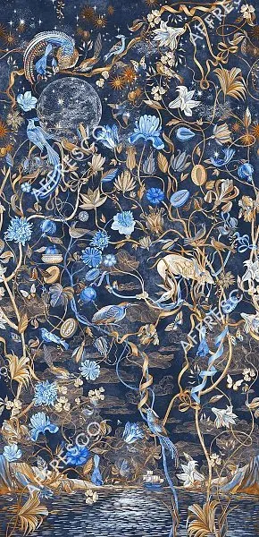 Фрески Affresco из коллекции Art Fabric представляют собой рулонный декор, имитирующий классическую фреску. Данный продукт включает изображения птиц, растений и веток, выполненные в синих тонах, что придает помещению элегантный вид.