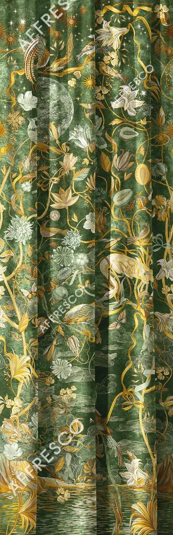 Фрески Affresco из коллекции Art Fabric Ткани предлагают уникальный способ оформления интерьера. Изображение птиц и растений создает гармоничную атмосферу, подходящую для гостиных и спален.