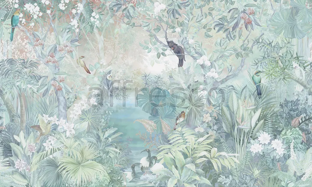 Фрески Affresco из коллекции Atmosphere предназначены для создания уникального интерьера. Эта модель, артикул AF510-COL2, подходит для оформления спален и гостиных. Сюжетный рисунок с изображением растений и птиц придаёт помещению спокойствие и гармонию.