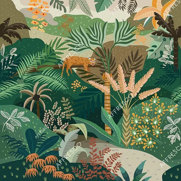 Фреска Affresco Fantasy арт-AF2199-COL4 выполнена на флизелиновой основе и предназначена для оформления детских помещений. Сюжет включает изображения животных и растений в успокаивающих зеленых оттенках, что создает гармоничную атмосферу.