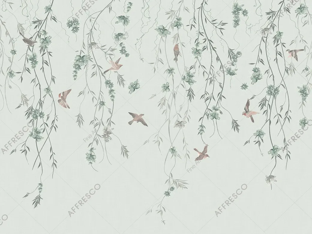 Фрески Affresco из коллекции Fine Art представляют собой высококачественные фотообои, выполненные на флизелиновой основе. Данная модель (артикул RE925-COL4) украшена изображениями птиц, растений и веток, что делает ее подходящей для оформления интерьеров в английском стиле.