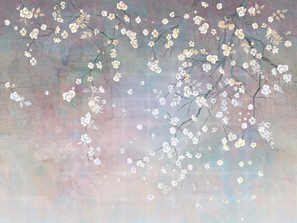 Фрески Affresco из коллекции New Art представляют собой эко обои с изображением растений, веток и листьев. Они подходят для оформления гостиных и спален, создавая уютную атмосферу. Данная модель включает темные и светлые тона с акцентом на глубокие оттенки синего и розового.