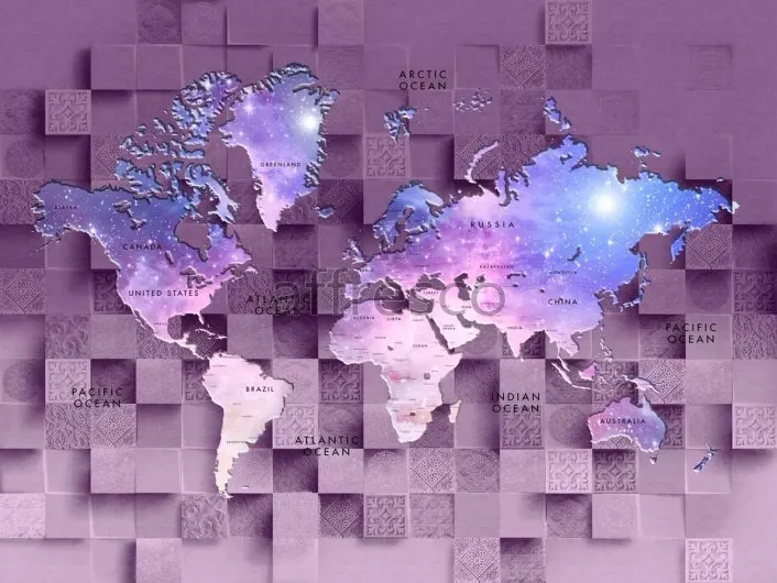 Фрески Affresco из коллекции New Art представляют собой эксклюзивное решение для декорирования интерьера кабинета. Они выполнены на флизелиновой основе и имеют уникальный дизайн с изображением карт мира и квадратов, что подчеркивает основательность и стабильность. Основной цвет — фиолетовый, который эффектно выделяется в интерьере.